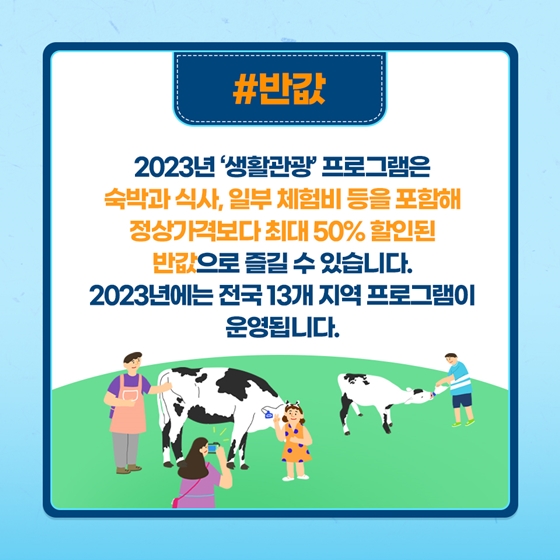 2023년 '생활관광' 프로그램은 숙박과 식사, 일부 체험비 등을 포함해 정상가격보다 최대 50% 할인된 반값으로 즐길 수 있습니다. 전국 13개 지역 프로그램이 운영됩니다.