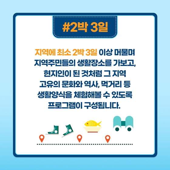 지역에 최소 2박 3일 이상 머물며 지역주민들의 생활장소를 가보고, 현지인이 된 것처럼 그 지역 고유의 문화와 역사, 먹거리 등 생활양식을 체험해 볼 수 있도록 프로그램이 구성됩니다.