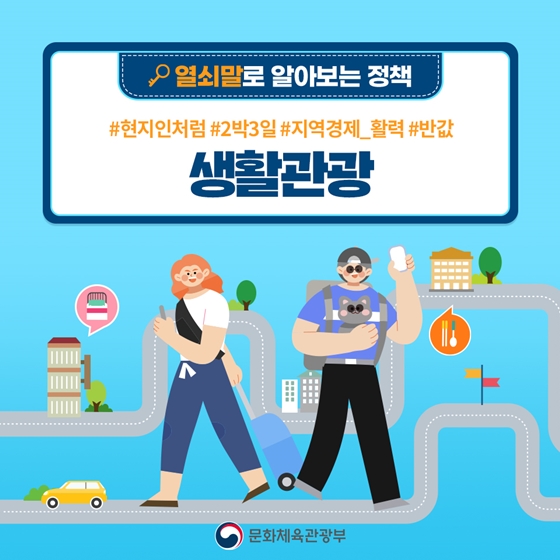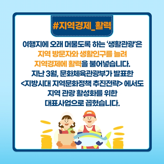 여행지에 오래 머물도록 하는 '생활관광'은 지역 방문자와 생활인구를 늘려 지역경제에 활력을 불어넣습니다.지난 3월, 문화체육관광부가 발표한 <지방시대 지역문화정책 추진전략>에서 지역 관광 활성화를 위한 대표사업으로 꼽혔습니다.