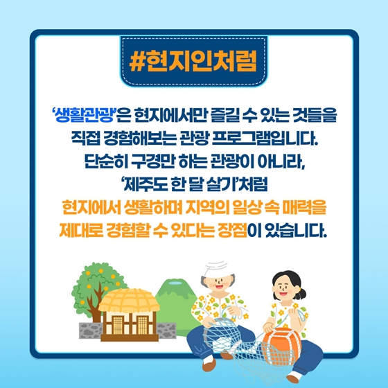 '생활관광'은 현지에서만 즐길 수 있는 것들을 직접 경험해 보는 관광 프로그램입니다. 단순히 구경만 하는 관광이 아니라, '제주도 한 달 살기'처럼 현지에서 생활하며 지역의 일상 속 매력을 제대로 경험할 수 있다는 장점이 있습니다.