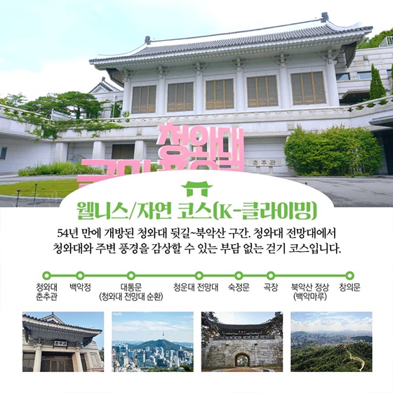 ■ 54년 만에 개방된 청와대 뒷길~북악산 구산, 청와대 전망대에서 청와대와 주변 풍경을 감상할 수 있는 부담 없는 걷기 코스입니다.